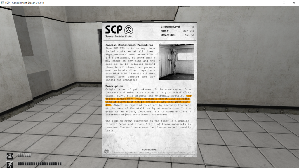 このホラーゲームは、このSCP-173 が逃げ出して、めちゃくちゃになった施設から脱出すという内容で、