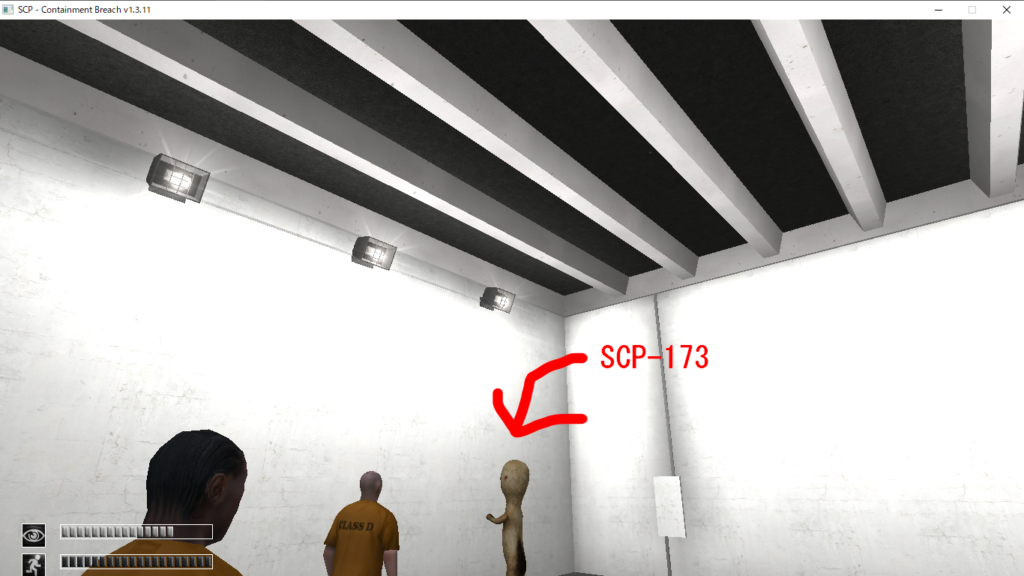 画面の真ん中の下に移っている少し肌色っぽい灰色の化け物か、SCP-173 です。