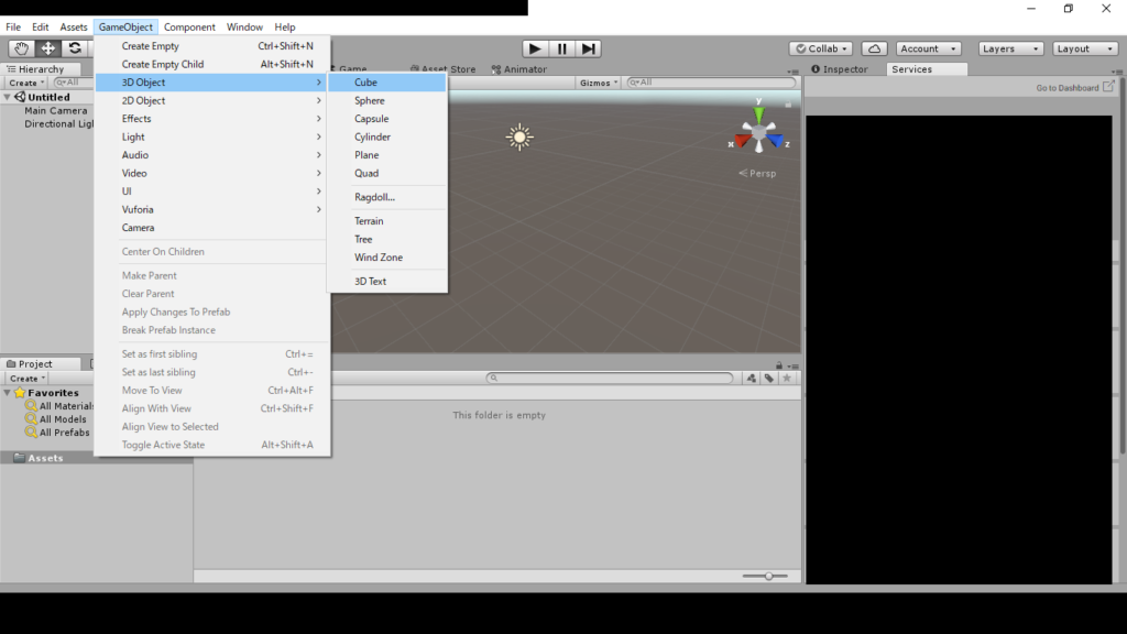 gameobjectの3d objectのcubeを選択します。