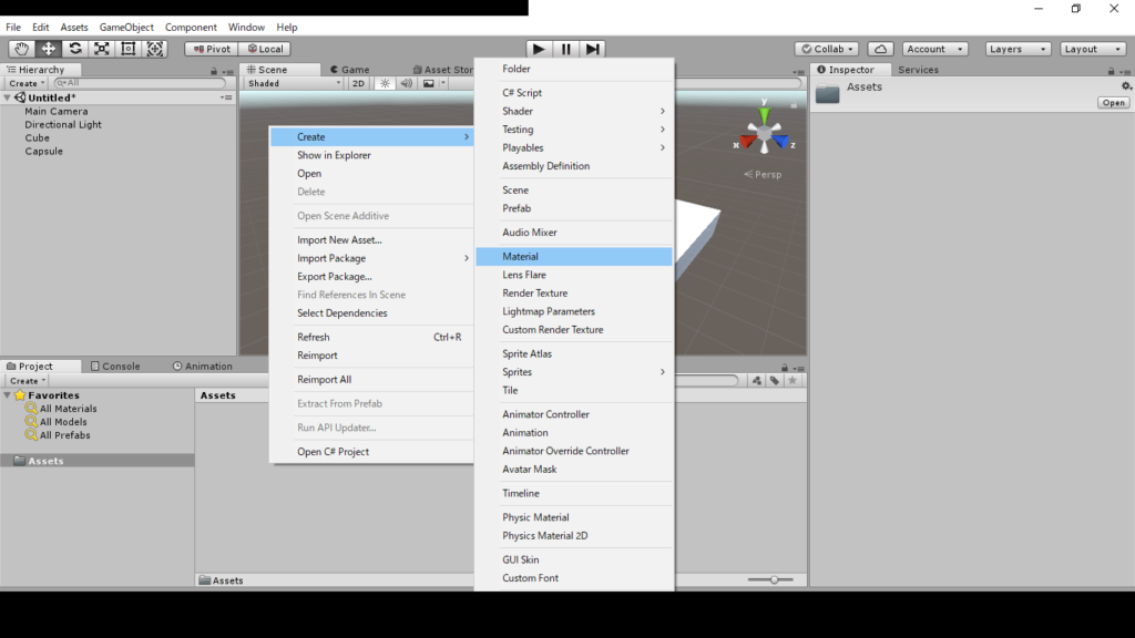 Assetsの何もない所で、右クリックして、createのmaterialを選択します。