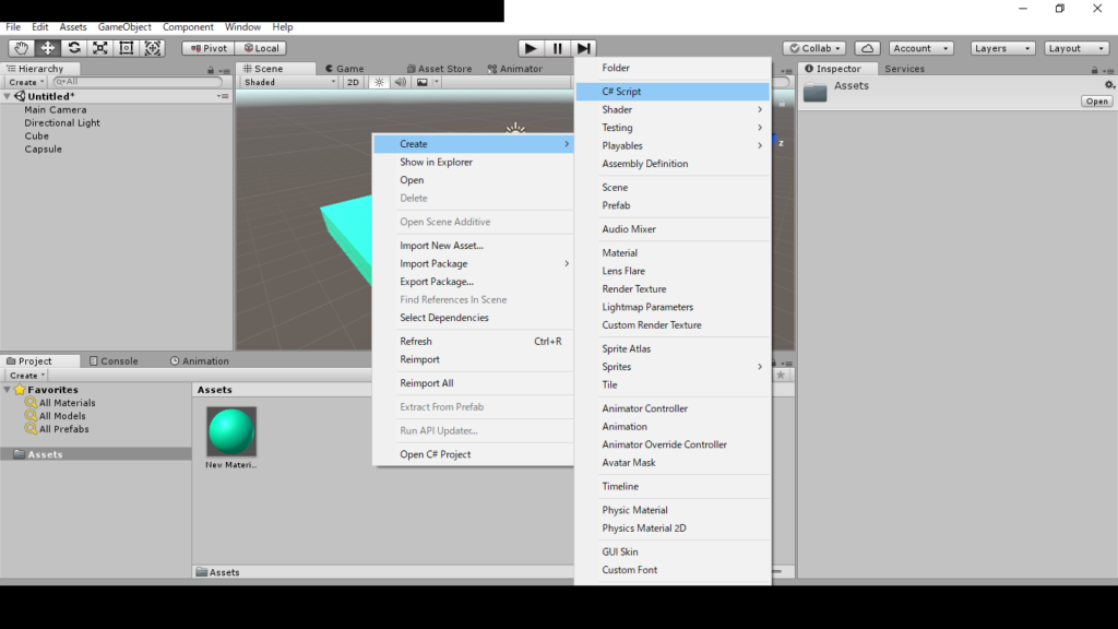 Assetsの何もない所を右クリックして、createのC# Scriptを選択します。