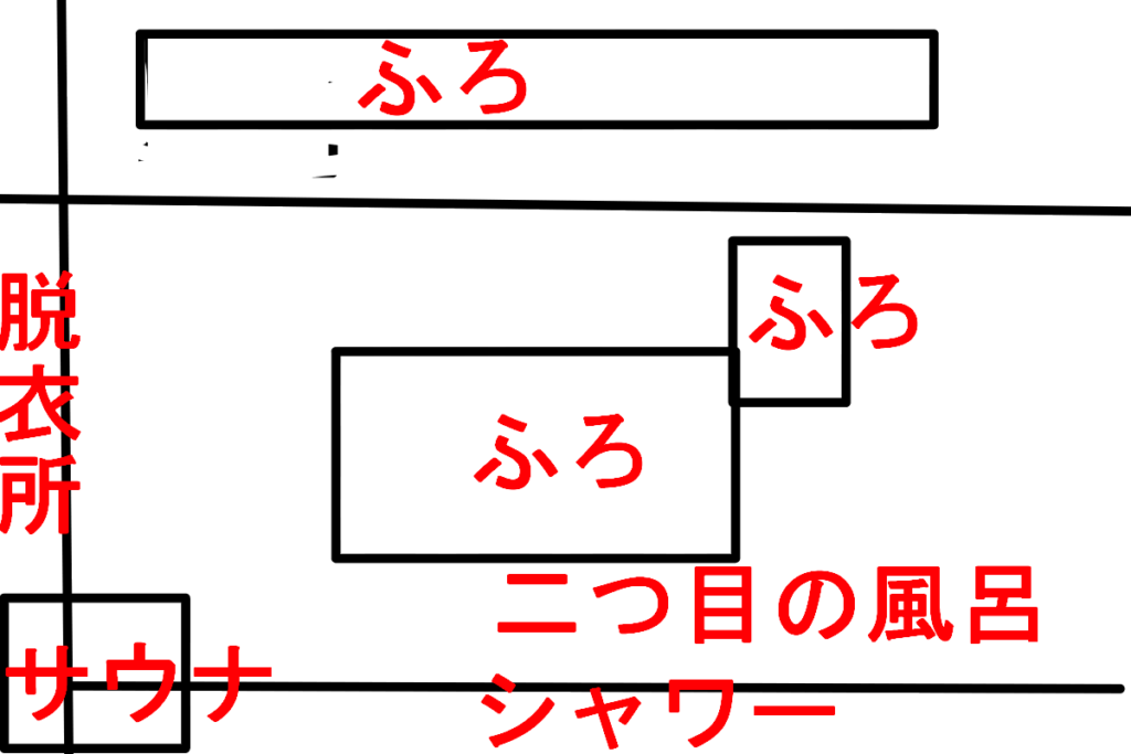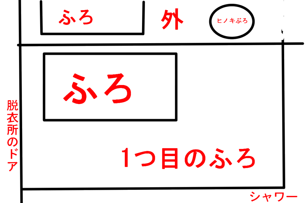 温泉は、さすがに写真が撮れないので手書きの間取りです。
