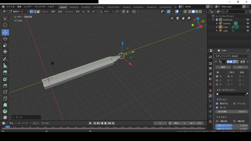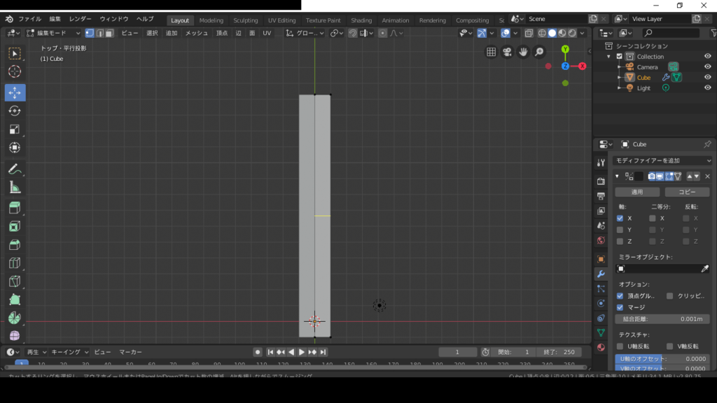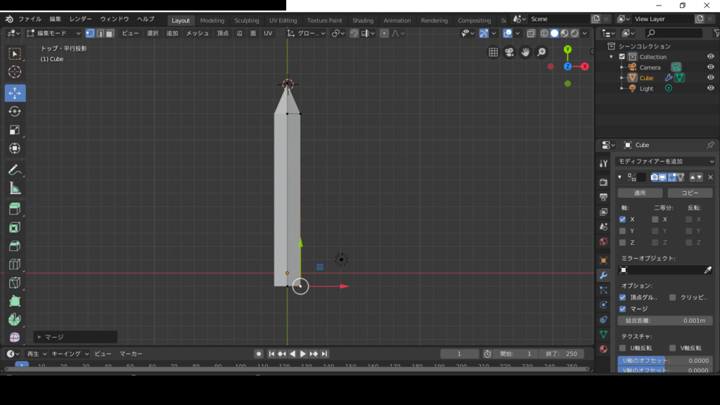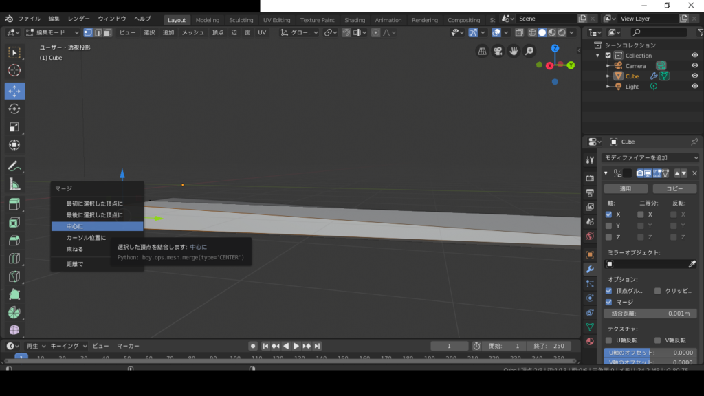 そしたら、上の頂点を選択して、altとMを押して、真ん中に、頂点を合わせます。